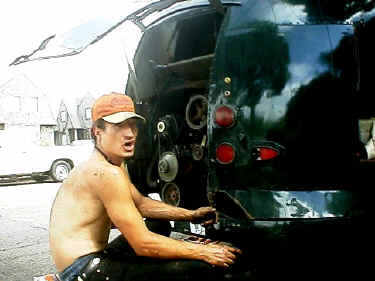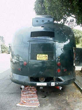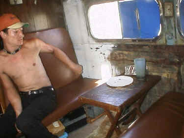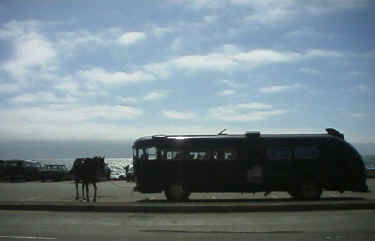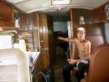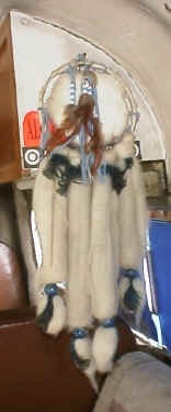 Comet", going with "Iron Horse" instead. He said it took him 10 years and $17,000 to get this beast on the road. His first idea was to put a sail on it and ride the wind across the desert. But now she's more conventionally mobile, and with one hell of an ass I might add. According to Hailey it has 16 RV batteries so he can play his electric guitar at concert volumes and his television. Pointing to the bedroom the kitchen the dining room and of course the stables. Actually that's a mounted policeman's horse. This bus is so damn beautiful it even bridges entrenched rivalries: the cop brought lox and bagels by, just because he liked the bus. Hailley's Indian headdress/dream chaser. Of the cops he had said, "They're always trying to push me into an apartment, so I can join their rent conspiracy. I tell them this whole country is my home, coast to coast." |